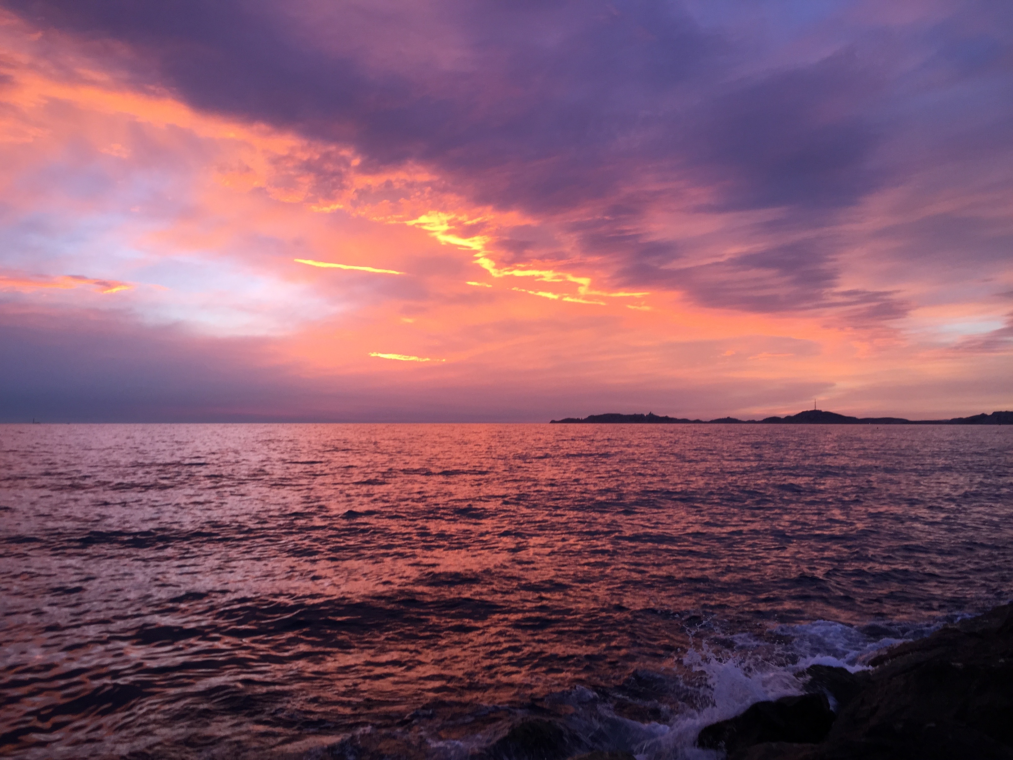 Premier spot : la Corniche. Pour prendre la meilleure photo, promenez-vous le long de son banc, et attendez le coucher du soleil sur les îles du Frioul. Après la plage des Catalans, vous avez une vue imprenable sur Notre Dame de la Garde, le Vallon des Auffes, son petit port de pêche et ses pointus colorés.
